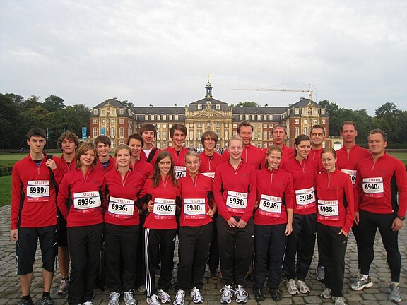 Am letzten Wochenende gingen wie geplant ganze fünf Staffeln des Geschwister-Scholl-Gymnasiums in Münster Kinderhaus, gemischt aus SchülerInnen und LehrerInnen der Schule, beim diesjährigen Münster-Marathon an den Start. Nach einer monatelangen Vorbereitung der LäuferInnen im Rahmen der Marathon-AG unter der Leitung von Sportreferendar Herrn Dr. Dörfler konnten die LäuferInnen nun endlich vor großem Publikum zeigen und auskosten, worauf sie solange trainiert haben. Die eigens für diesen besonderen Tag erstellten Laufshirt mit dem Aufdruck „Courage-Marathon“ wiesen darauf hin, dass es vornehmlich das Ziel war als Gemeinschaft innerhalb der Staffel die 42,195km der Strecke zu bewältigen und somit entsprechend des Mottos der Courage-Schüler-Stiftung „gemeinsam ein Zeichen setzen“ zu können. Jede der fünf Staffeln kam ohne Probleme innerhalb der vorgegebenen Zeit ins Ziel, wobei die schnellste Staffel sogar unter 3:45h blieb! Und bereits kurz nach dem Zieleinlauf kamen erste Anfragen, wann der nächste Marathon-Lauf statt findet. Die Vorbereitungen für den Münster-Marathon 2011 laufen alsbald an…
