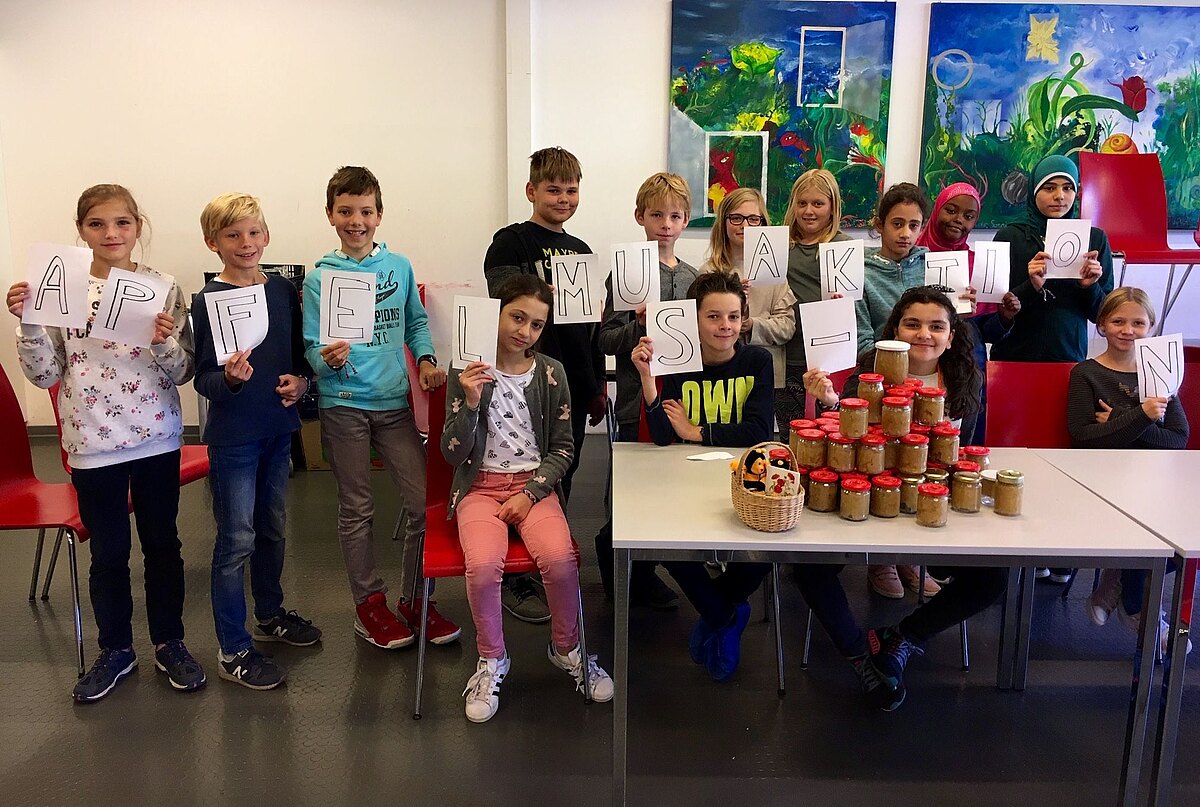 Passend zur Jahreszeit und mit wunderbarer Unterstützung durch die Mitarbeiterinnen der Mensa durften interessierte Schülerinnen und Schüler der Klasse 5b zusammen mit ihren Klassenlehrerinnen Frau Börger und Frau Vagedes in der Mensa aus gesammelten Äpfeln Apfelmus herstellen. Auch wenn das Schälen und Schneiden der Äpfel bisweilen mühsam war, hielten alle tapfer durch und lernten sich dabei obendrein auch weiter besser kennen, denn bei der Verarbeitung der Äpfel konnte man zugleich prima erzählen. Das leckere Apfelmus wird im Bekannten- und Kolleg*innenkreis verkauft. Der Erlös soll in die Klassenkasse fließen.