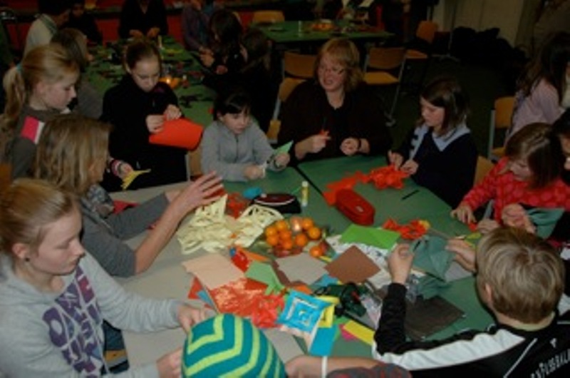 Mit der Schere und dem Kleber in der Hand ließ sich jedoch auch plaudern und erzählen, so dass auch der gemeinsame Austausch zwischen Eltern und Eltern und Kindern nicht zu kurz kam. Zwischen den einzelnen Bastelprojekten stärkte man sich bei Kaffee, Saft, Kuchen und Keksen und die Kinder nutzten das leere Schulgebäude wieder gerne zum Fangenspielen.