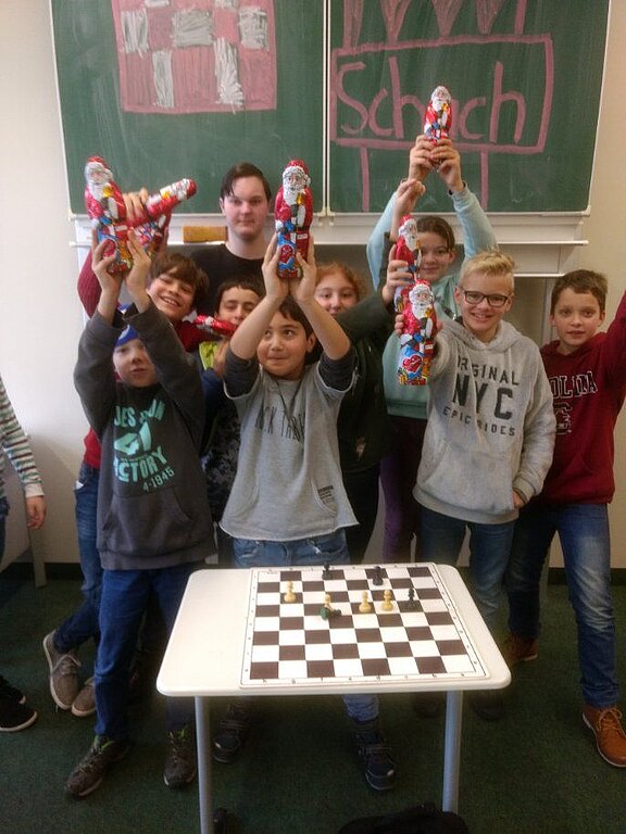 Nach zehn Wochen gemeinsamen Schachspielens wurde das Gelernte in einem Nikolausturnier angewendet. Die Schüler*innen übten sich im Gedächnistraining, einzügigen Mattaufgaben und in dem Spiel „Bauernkloppe“. Zum Schluss wurden die Nikoläuse (natürlich aus Schokolade) verteilt und teilweise auch schon angeknabbert.