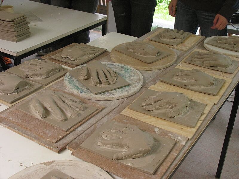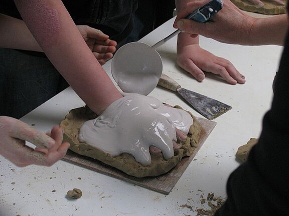 Die Jungen der Klasse 7a durften zudem ihrer kreativen Ader gänzlich freien Lauf lassen. Frau Häuser lud sie ein, in ihrer „Werkstatt für Gestaltung“ am Konermannweg Handabdrücke aus Ton zu fertigen und daraus eine Buchstütze herzustellen, die sicher noch in etlichen Jahren ihr heimisches Bücherregal zieren wird, denn die Ergebnisse können sich wahrlich sehen lassen! Unter der fachkundigen Anleitung von Frau Häuser wurde eifrig gematscht, geknetet und geformt - eine spannende und, wie die Fotos beweisen, im wahrsten Sinne des Wortes „feucht“-fröhliche (Team-)Arbeit, die allen Jungen der Klasse großen Spaß gemacht hat! Deshalb werkelten die Schüler auch anstandslos über das Ende der 6. „Unterrichtsstunde“ hinaus weiter an ihren Händen, um diese reif für den Brennofen zu machen. Auf das endgültige Produkt dieser Handarbeit warten nun alle gespannt!