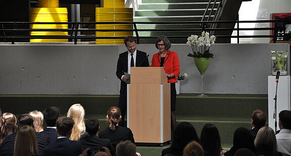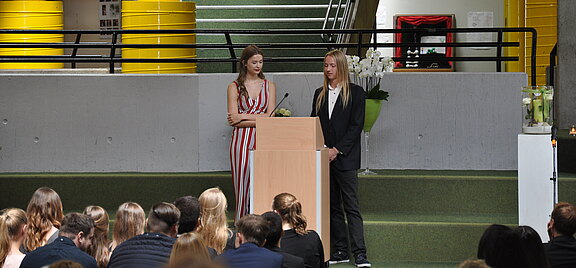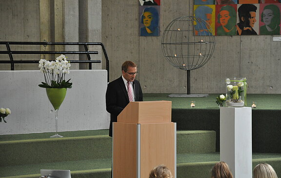 Die Abiturientia dieses Jahres ist der letzte G 8-Jahrgang am Geschwister-Scholl-Gymnasium. Bei der feierlichen Verabschiedung der 53 Abiturient*innen freute sich der Schulleiter mit den Schülern seine allererste Studienfahrt als Lehrer erleben zu dürfen: "Allein deshalb seid ihr für mich eine ganz besondere Stufe.” Auch Anica Wesjohann und Ralph Carrie als Jahrgangsstufenleitung sowie Sandra Schlatman und Kurt Johannesmann als Elternvertreter der Jahrgangsstufenpflegschaft wandten sich in Grußworten an die Abiturienten: „Es geht um das Wissen, ums Wagen und darum, gerne zu leben”, erläuterte Kurt Johannesmann. „Denn eure Geschichte schreibt ihr nun allein weiter.”