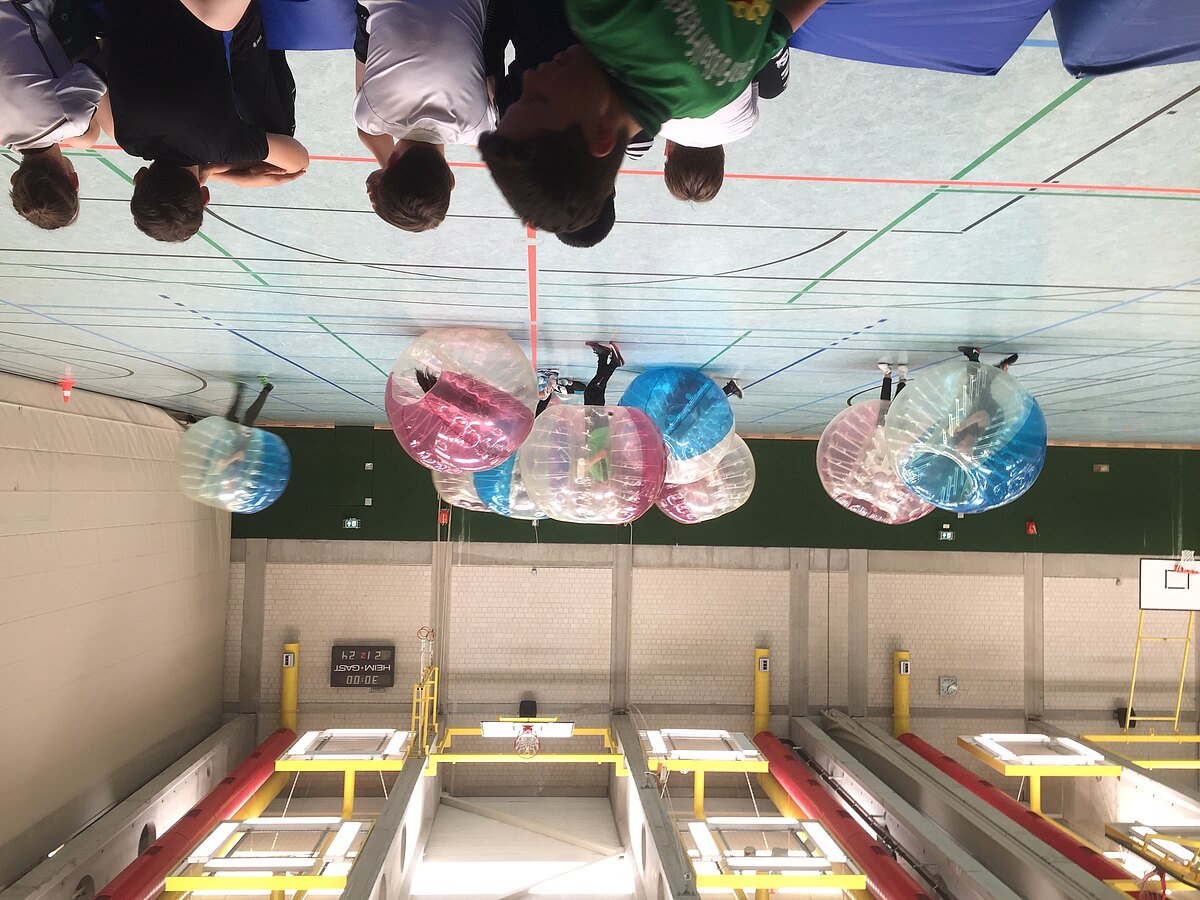 Gemeinsam mit unserem Paten, dem SC Preußen Münster, eine Aktion für unsere Schule zu planen, ist unser erklärtes Ziel als Schule ohne Rassismus/Schule mit Courage. Aber nur Fußball spielen? Das war uns zu langweilig. Darum haben Herr Förster, Herr Karsten und Frau Engemann – unter tatkräftiger Mitwirkung von Herrn Groß-Bölting – ein BubbleBall-Turnier für alle siebten Klassen organisiert. Dank dem Unternehmen Mister Neo konnten wir problemlos 10 Bubbles ausleihen und unsere Nachbarschulen überließen uns freundlicherweise die gesamte Halle A für unser Bubble-Ball Turnier. Glas Niggemann sorgte für Abwechslung in den Spielpausen: Die super Glas-Torwand sorgte nicht nur bei den Preußen-Spielern für Spaß spannende Wettkämpfe. Um 10 Uhr starteten unsere 70 energiegeladenen Siebtklässler*innen in der Sporthalle. Nach ein paar gemeinsamen Aufwärmspielen rollten ab 11 Uhr die ersten Bubbles. Schon nach der ersten Runde waren alle k.o. und konnten es kaum erwarten weiter zu spielen. Fußballer*innen, ebenso wie eigentlich sport-unlustige Schülerinnen und Schüler hatten Riesenspaß in den Bubbles, und auf einmal war es überhaupt nicht mehr wichtig, mit und gegen wen man spielt, ob man den Ball trifft oder selbst zum Ball wird, und wer am schnellsten im Tor ist (als Spieler oder als Ball).