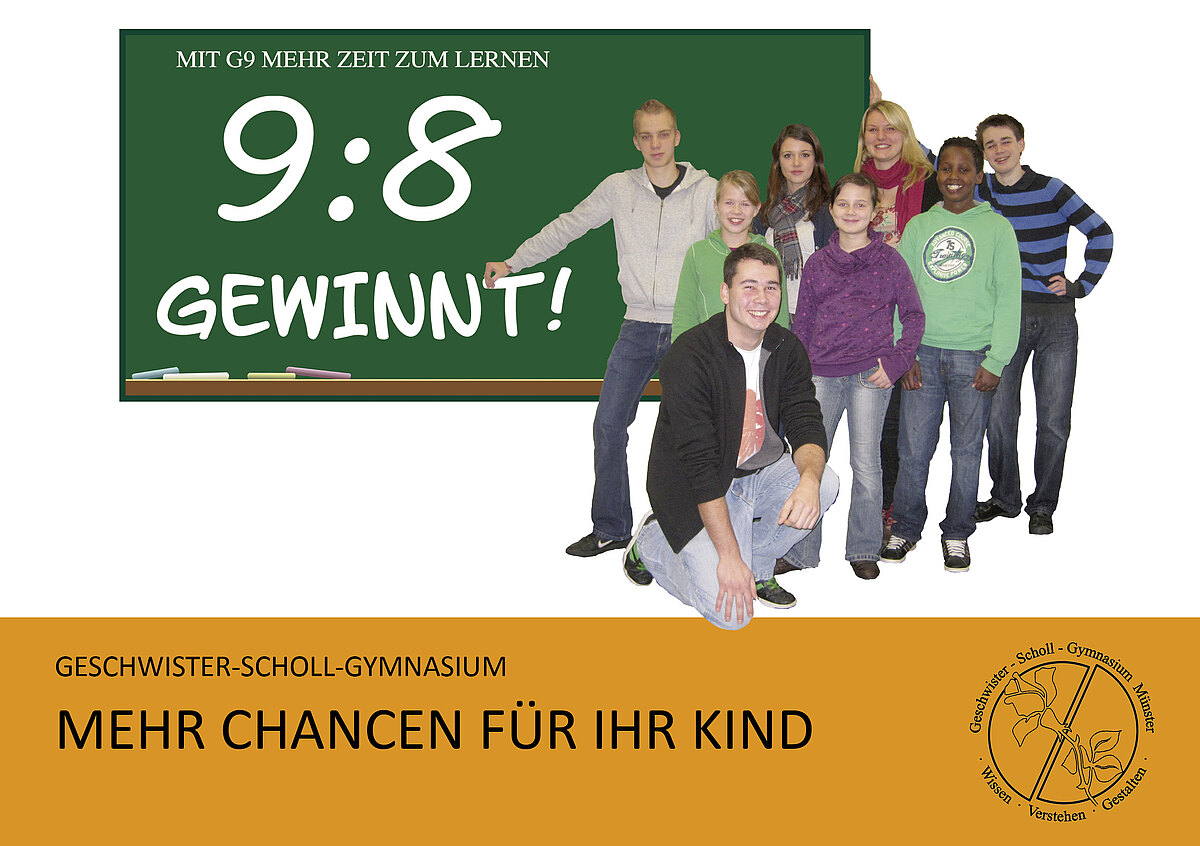 Unter dem Slogan „9 : 8 GEWINNT!“ bietet das Geschwister-Scholl-Gymnasium am kommenden Mittwoch, 19. Januar, eine Informationsveranstaltung zur neunjährigen Schulzeit am Gymnasium ("G 9 neu") an. Die Veranstaltung beginnt um 20 Uhr im Pädagogischen Zentrum des Kinderhauser Gymnasiums. Sie richtet sich an alle Interessierte, vorrangig an Eltern von Grundschulkindern in der Stadt, die sich über die Angebote der weiterführenden Schulen informieren wollen. Ergänzt wird die Informationsveranstaltung durch einen „Tag der offenen Tür“ am darauf folgenden Freitag, 21. Januar, um 15 Uhr. Grundschüler und ihre Eltern werden dann Gelegenheit haben, Kostproben der schulischen Aktivitäten des Gymnasiums zu erleben – Selbstbeteiligung inklusive.