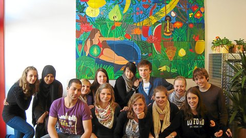 Abiturienten des Geschwister-Scholl-Gymnasiums, Schüler des Grundkurses Kunst, widmen ihrer Schule zum Abschied ein großes Wandbild: Sie haben ein acht mal zwei Meter großes, dreiteiliges Wandbild auf Leinwänden für die Ausstattung der neuen Mensa gestaltet.