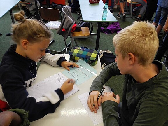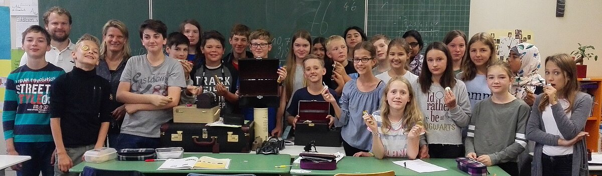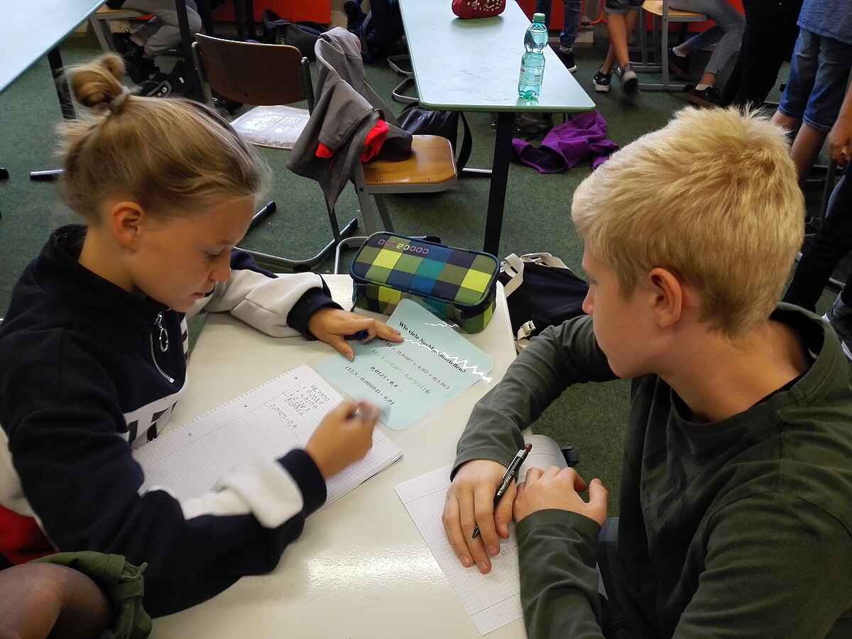 Die Matherätsel boten einen bunten Rückblick auf den gesamten Stoff des vergangenen Schuljahrs und wurden erfolgreich bewältigt: Beide Klassen 6b und 6d gelangten in den vorgegebenen 45 Minuten bis zur letzten Kiste, in der zur allgemeinen Freude neben dem ersehnten Schlüssel auch noch viele goldene Süßigkeiten zu finden waren.