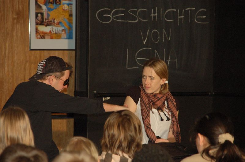 Die Aufführung am Lernort Schule hatte auch etwas mit der Thematik des Stückes zu tun. Denn - so erläuterten die beiden Schauspieler Kathrin-Marén Enders und Marek Sarnowski, die zwischendurch auch in die Rolle eines Erzählers schlüpften - was Lena erlebt, kann überall und jedem passieren, nämlich von der Gruppe geärgert, ausgegrenzt, modern gesprochen "gemobbt" zu werden.