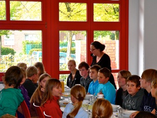 Gegen Mittag traf man sich nach getaner Arbeit in der Schulmensa, wo den Fünftklässlern, den heiß geliebten Paten aus der Jahrgangsstufe 9 und den Klassenteams ein leckeres und liebevoll zubereitetes Mittagessen serviert wurde. Das war sicherlich eins der Highlights dieses Tages, bei dem es sich auch der Schulleiter, Herr Breitenbach, nicht nehmen ließ, vorbeizuschauen und sich mit an den Mittagstisch zu setzen.