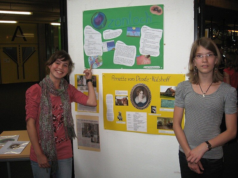 Gemeinsam mit ihr erstatteten weitere 80 Sechstklässler des Geschwister-Scholl-Gymnasiums ihren Eltern und Lehrern Bericht über ihre persönlichen Interessengebiete, mit denen sie sich ein halbes Jahr lang im Rahmen des Forder-Förder-Projekts beschäftigt hatten. Die Themenpalette war vielfältig, sie reichte von Göttern in Tiergestalt, der aufregenden Unterwasserwelt, dem Ozonloch oder Alexander dem Großen bis zur westfälischen Dichterin Annette von Droste-Hülshoff. Auf großformatigen Plakaten präsentierten die jungen Forscher im Pädagogischen Zentrum der Schule ihre Ergebnisse.
