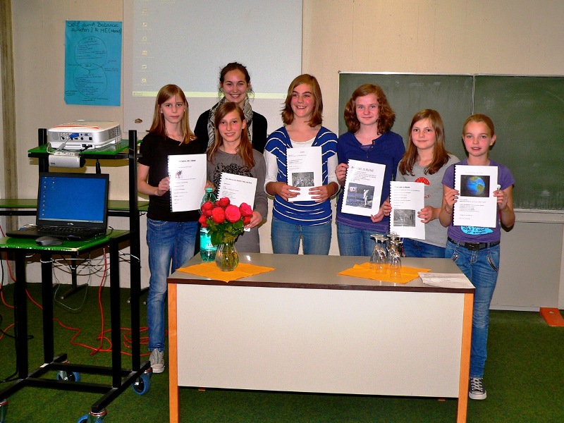 Auch sechs Schülerinnen aus den beiden fünften Klassen freuten sich am vergangenen Donnerstag über ihre gelungenen Vorträge, in denen sie die Themen ihrer Expertenarbeiten, die sie im letzten Halbjahr erstellt hatten, ihren Eltern, Großeltern, Klassenkameradinnen und Lehrern vorgestellt hatten. Dabei erfuhren die Zuhörer Spannendes sowohl über "klassische" Themen wie die Entstehung der Erde oder die bemannte Weltraumfahrt als auch über lokalspezifische Fragen wie die Tierhaltung im Allwetterzoo Münster oder die münstersche Promenade. Sophie Voß, Jasmin Wrana, Katrin Merschformann, Carolin Sieg, Anne König und Nina Lülff (von links nach rechts) hatten am "Drehtürmodell" des Förder-Forderprojekts teilgenommen. Auch sie hatten sich mit persönlichen Interessengebieten beschäftigt, verließen jedoch in zwei Stunden während des Vormittags ihre Klassen, um an ihren Themen zu arbeiten und mussten den versäumten Stoff eigenständig nacharbeiten. Während der "Drehtürstunden" wurden sie tatkräftig von Mareike Schulze-Elfringhoff unterstützt, die das Projekt als Praktikantin neben der Klassenlehrerin der 5b, Frau Vagedes, begleitete.