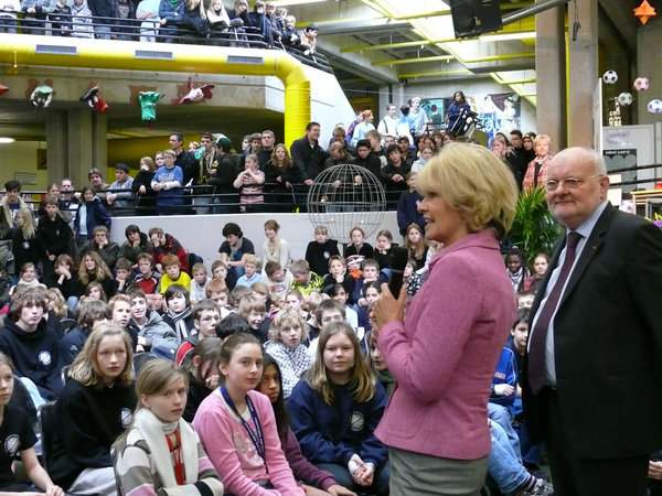 Zurück im Pädagogischen Zentrum wurde sie dann von der gesamten Schülerschaft erwartet und mit großem Applaus begrüßt. Sie trug sich ins Gästebuch ein, und erhielt als Geschenk eines der neuen Schul-T-Shirts. Jubel brandete auf, als die Ministerin ganz spontan ihre Jacke aus- und das Schulshirt anzog. Keine Frage, der Ministerin hat es im Gymnasium gefallen, den Schülern dankte sie für den tollen Empfang.