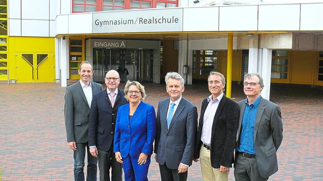 Das Kinderhauser Schulzentrum hatten Wissenschaftsministerin Svenja Schulze, Oberbürgermeister Markus Lewe und Stadtrat Thomas Paal ausgesucht, um über einen Zuschuss von 20 Millionen für Münsters Schulen zu informieren.