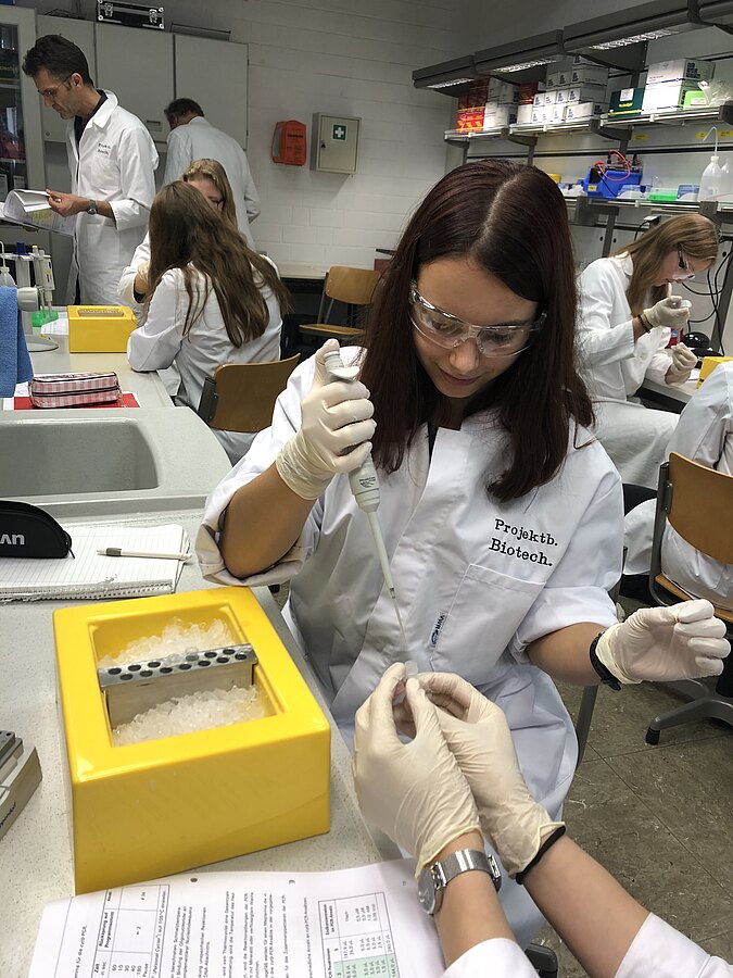 Zuvor haben wir uns im Unterricht ausgiebig auf das bevorstehende Tagesprogramm im Labor vorbereitet. Mithilfe eines von dem Projektlabor zur Verfügung gestellten Skriptes zum detaillierten Ablauf des Versuches konnten wir uns einen Überblick verschaffen und erste aufkommende Fragen klären.