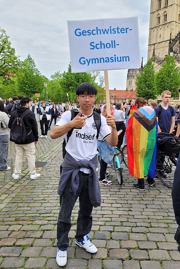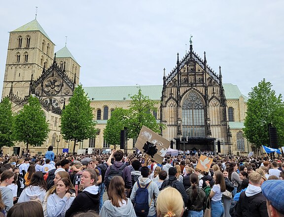 Alle Klassen der Jahrgangsstufe 7 bis Q1 begaben sich nach der ersten Stunde gemeinsam auf einen Friedensmarsch zum Domplatz, um gemeinsam mit 19 anderen Schulen aus Münster die Eröffnung des Jubiläumsjahres zu feiern. Über die für den Verkehr gesperrte Kanalstraße gingen unsere Schüler*innen auf Initiative der SV die 5 Kilometer bis zur Innenstadt zu Fuß - klimaneutral sozusagen.