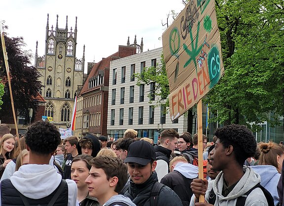 In der vom Theater im Pumpenhaus organisierten Friedens~Bewegung demonstrierten rund 7000 Münsteraner Schüler*innen in einem Sternmarsch von den Schulen bis zum Prinzipalmarkt für den Frieden. Bereits seit Anfang des Jahres gab es verschiedenste Projekttage an den Schulen, die Friedensarbeit und -Bewegungen auf künstlerische Art und Weise erlebbar machten. Sie finden Ihren Ausdruck auch in der Gestaltung der Demonstration, bei der verschiedene Musik- und Lyrik-Beiträge von Schüler*innen präsentiert wurden. In durchweg friedlicher Atmosphäre wurde dann gegen 12 Uhr das Friedensjubiläum durch die umliegenden Kirchen eingeläutet.