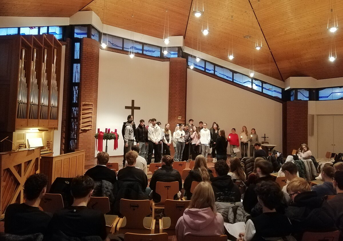 Musikalisch wurde die Andacht von Schülerinnen und Schülern der Jahrgangsstufe 5 sowie dem vokalpraktischen Kurs der Q1 unter der Leitung von Frau Bergin begleitet. Frau Schlüter und Herr Vermillion begleiteten am Klavier und am Cello!