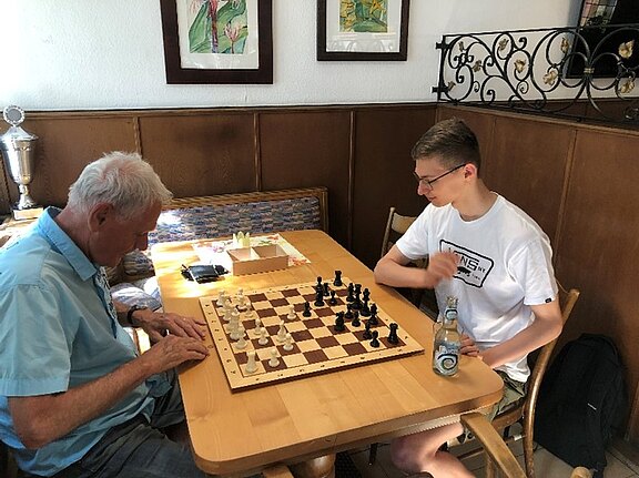 Damit war das Kontigent unserer Vereinsspieler auch schon erschöpft. Am 2. Brett vertrat Phil Benneweg die „Farben“ des GSG. Nach anfänglichem ausgeglichenem Spiel übersah der Gegner (auch ein Vereinsspieler) eine kleine Kombination und Phil bog sicher auf die Siegesstraße ein.