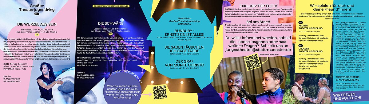 Es sind jeweils sehr gute Plätze - fast immer im Parkett. Auf dem Flyer befindet sich ein QR-Code, der zur Instagram-Seite des Theaters führt mit Hintergrundinformationen zu den Stücken. Die Altersangaben zu den Stücken sind ungefähre Richtwerte. Interessierte melden sich bei der Koordinatorin des Theaterjugendrings, Frau Bergin, die auch alle Vorstellungen des TJR begleitet. Treffpunkt ist immer vor dem Theater. Die Termine starten ab November/Dezember. Falls jemand bei einem Termin verhindert sein sollte, hat es bis zum Vortag der Aufführung die Möglichkeit, die Karte kostenfrei umzutauschen oder auf einen Freund/eine Freundin/Geschwister zu übertragen.