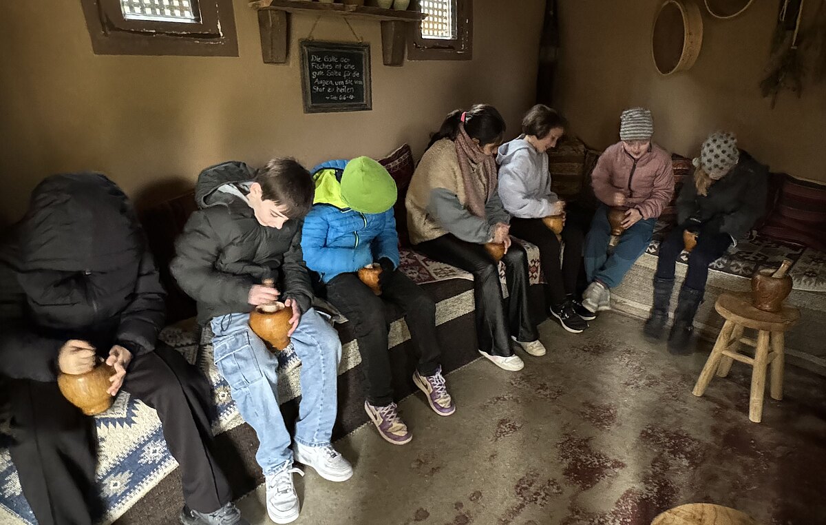 Wir durften auch sehr viel ausprobieren, z.B. Mehl mahlen. Es war sehr anstrengend, aber es hat sehr viel Spaß gemacht. Die Frauen früher haben nur eine Stunde für 1 kg Mehl gebraucht. Wir haben auch handgefertigte Sachen gemacht, so wie Kräutersalz, einen Hammer und ein Seil. Auch das Essen von früher war sehr lecker! Wir durften es selber probieren.