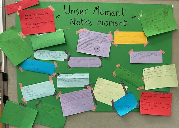 Aber zunächst einmal von vorne: Am Donnerstag, den 20. März haben wir Ysatis, Nolan, Adèle, Louise, Noélie, Laureyna, Philémon, Sacha, Maï-Lee, Gabriel, Lou, Elise, Charline, Noah, Lily, Jwanna, Benjamin, Elena, Juliette und ihre LehrerInnen Madame Pujo und Monsieur Cherrie am Bahnhof in Empfang genommen. Dann lag ein volles Programm vor uns: Am Montag ging es mit dem ICE nach Bremen, wo wir das Universum besuchten und natürlich auch die Bremer Stadtmusikanten und andere Sehenswürdigkeiten der Stadt in einem Rundgang erkundeten. Die Franzosen haben dann in den folgenden Tagen das Planetarium, den Aasee, das LWL-Museum, den Friedenssaal und den Wochenmarkt in Münster besucht. In den Unterrichtsalltag am GSG konnten die Franzosen ebenfalls hineinschnuppern, als sie ihre AustauschpartnerInnen in den Unterricht begleiteten und Französischkurse der Anfänger besuchten. Eine win-win-Situation, denn auf diese Weise bekamen auch unsere Siebtklässler die Gelegenheit, „echte französische Jugendliche“ kennenzulernen und mit ihnen ins Gespräch zu kommen. Am Donnerstag stand dann noch ein deutsch-französischer Bowling-Abend auf dem „offiziellen“ Programm. Bei der Abschlussrunde am Freitag Morgen in der Schule haben die Austauschpaare noch einmal die gemeinsame Woche Revue passieren lassen und „ihren Moment“ auf einem Plakat notiert: Dabei war zu entdecken, dass es häufig die kleinen Momente des Alltags außerhalb des „offiziellen“ Programms waren, die das Highlight der Woche waren und besonders in Erinnerung bleiben werden. Erinnerungen, die besonders durch die persönlichen Begegnungen eines Schüleraustausches gemacht werden können. Wir sind also schon gespannt, welche gemeinsamen Momente auf unserem Gegenbesuch nach Bazas noch auf uns warten. Am 8. Mai geht's los...