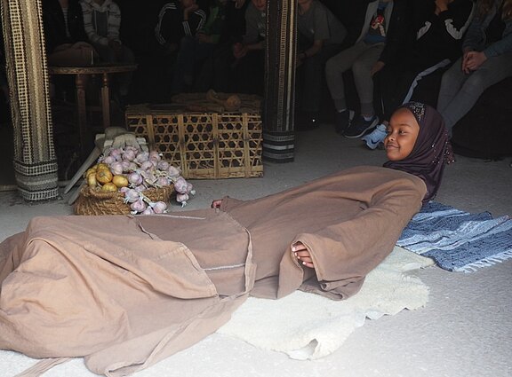 Anschließend gingen sie in ein Nomadenzelt. Hier erfuhren die Schülerinnen und Schüler, was die Menschen, die als Nomaden lebten, trugen, und dass, wenn einer aus der Gemeinschaft seine Aufgabe nicht erfüllte, nichts mehr funktionierte.