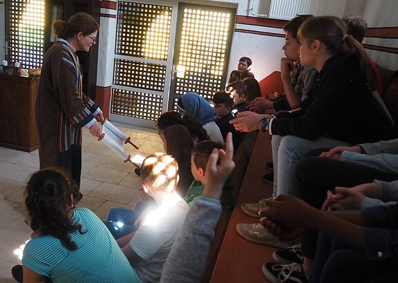 Als erstes ging die Klasse 5b in die Synagoge. Dann ging es in einem Raum mit einer großen Karte von Israel weiter. Dort guckten die Schülerinnen und Schüler, welche Städte sie schon kennen und hörten aufmerksam der Geschichte des helfenden Samariters zu.