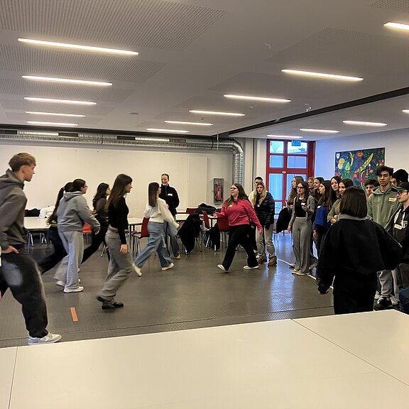 Das offizielle Programm begann am Montag mit icebreaker activities, einem gemeinsamen Frühstück an unserer Schule, der Begrüßung durch die Schulleitung und einer Schulführung. Aufgrund der Wetterlage musste kurzerhand umdisponiert und die Fahrradtour in das Naturschutzgebiet „Rieselfelder“ ersetzt werden. Glücklicherweise konnten wir kurzfristig eine Backstage Tour am Theater Münster bekommen, sodass die Gruppe nach der Schulführung in die Stadt fuhr und einen spannenden Blick hinter die Kulissen des Theaters Münster erhielt. So gab es schon einen Vorgeschmack auf den Theaterabend am Donnerstag.