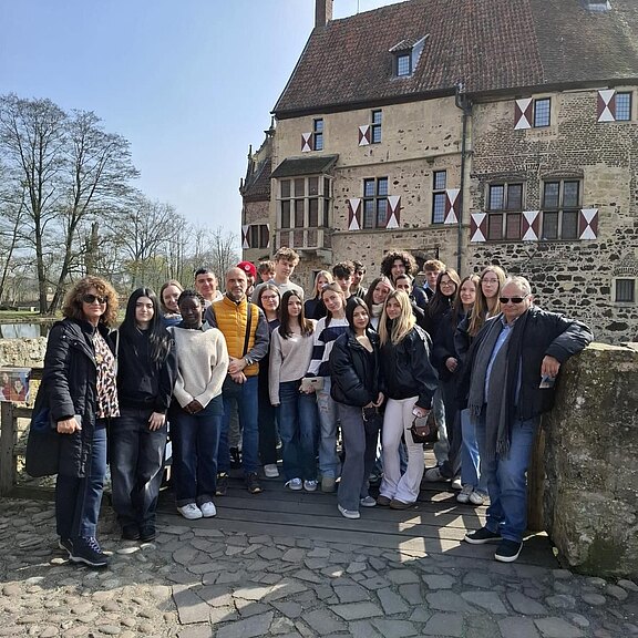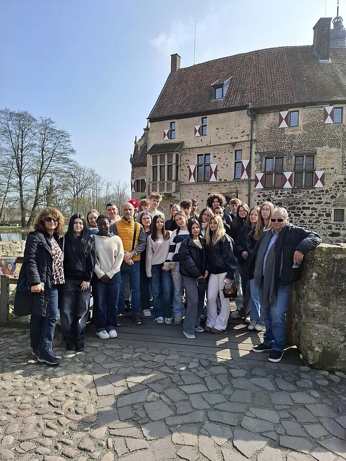 Am Freitag unternahmen alle einen Ausflug nach Lüdinghausen, wo Burg Vischering und Burg Lüdinghausen besichtigt wurden und die Schülergruppe mehr über Burgen im Münsterland erfuhr. Ein Spaziergang durch die historische Altstadt rundete den Tag ab. Am frühen Abend fand schließlich die Zertifikatsverleihung mit anschließender Abschiedsfeier mit Pizza und Snacks in der Schule statt, bei der ausgelassen zu Just Dance getanzt wurde.