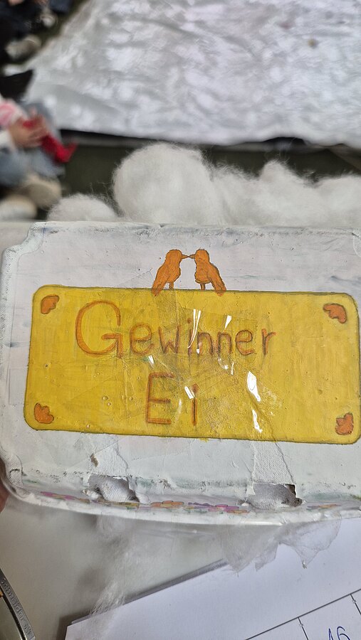 Während die Jury der Gruppe 1 aus Herrn Cyrus, Herrn Reuter und den Schülerinnen aus der SV, Zahra und Kaja bestand, bestand die Jury der 2. Gruppe aus Herrn Eberhardt aus dem Sekretariat, Herrn Lindemann dem Hausmeister, Frau Freitag aus der Mensa und Frau Engemann. Die Jury bewertete also nach und nach jede Bastelei nach Kriterien wie Flugfähigkeit, Optik und Nachhaltigkeit, Kreativität, Selbstgebasteltem und ob das Ei kaputt oder heile war.
