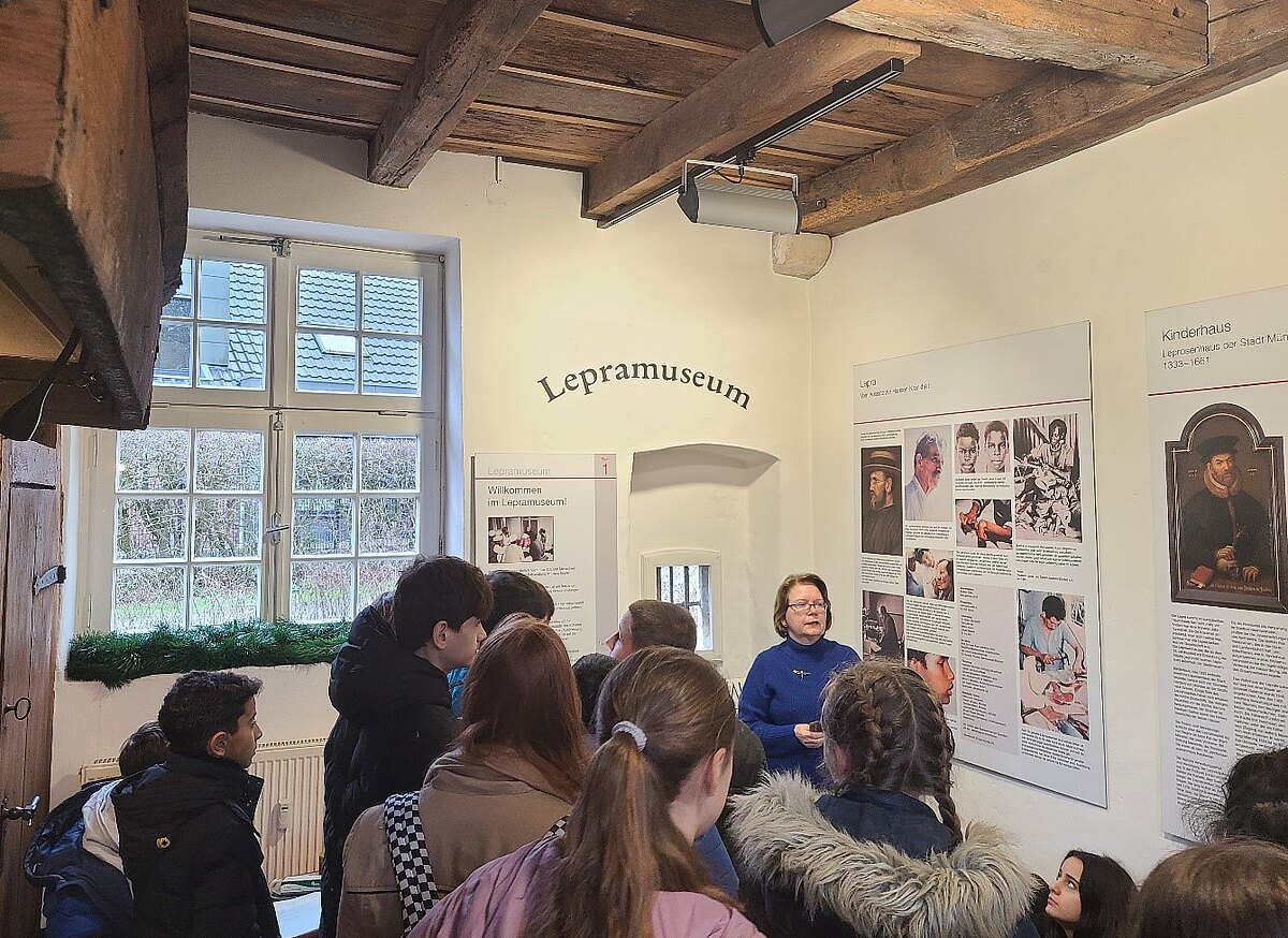 Am 18.12.2024 besuchte die Klasse 7b des Geschwister-Scholl-Gymnasiums das Lepramuseum in Münster-Kinderhaus mit ihrem Geschichtslehrer Herrn Vermillion und wurde von Frau Jahnke, die sich dort um Besucher kümmert, empfangen.