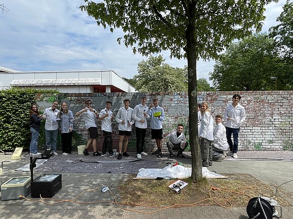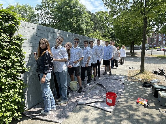 Die Schülerinnen und Schüler des Kunstkurses hatten den Entwurf für das Wandgemälde im Unterricht gemeinsam entwickelt, die Grundstücksmauer mühsam vorbereitet, den Entwurf in einer Abendaktion auf die Mauer projiziert und schließlich das Motiv gemeinschaftlich farbig auf die Mauer gemalt und ausgearbeitet.