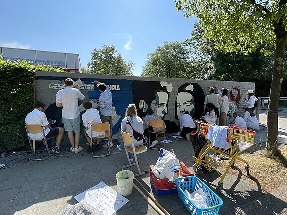 Schülerinnen und Schüler des EF-Grundkurses Kunst des Geschwister-Scholl-Gymnasiums haben unter der Leitung ihrer Kunstlehrerin Stephanie Daume ein eindrucksvolles Wandgemälde geschaffen. Darauf sind neben den Portraits der beiden Geschwister auch weiße und rote Rosen zu sehen, die sowohl an den Namen der Widerstandsgruppe erinnern, aber auch für Frieden, Mitmenschlichkeit und Nächstenliebe stehen sollen.