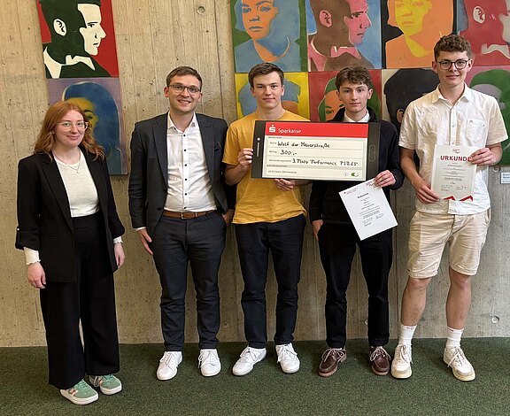 Von allen teilnehmenden Teams in Münster erreichten sie den 3. Platz und gewannen 300 €. Durch geschicktes Agieren und weitsichtige Analysen des Börsengeschehens gelang es den Schülern aus der Q2 in wenigen Monaten das fiktive Startkapital in dieser Simulation von 50.000 € auf über 65.000 € zu steigern. Das Organisationsteam der Sparkassse übergab den Scheck und gratulierte herzlich.