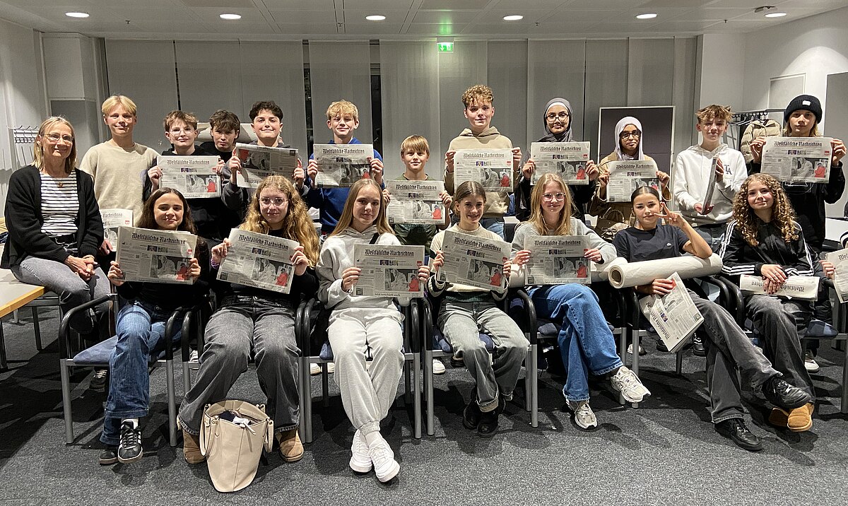 Am Abend des 24. November 2024 fuhr die Klasse 8B zusammen mit ihrer Deutschlehrerin zum Druckzentrum der Unternehmensgruppe Aschendorf An der Handelslinie 1, um Informationen für das Zeitungsprojekt zu sammeln, das in allen Klassen 8 in Kürze ansteht. Dabei erhielten wir viele spannende Informationen in Form eines Vortrags und einer Führung durch das abendliche Druckhaus.