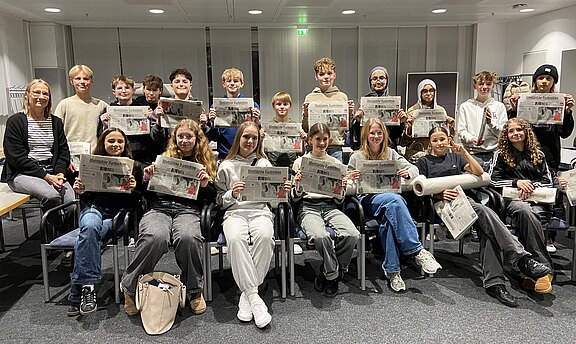 Anschließend ging es weiter in zwei Gruppen, die durch das Verlagshaus geführt wurden. Wir sahen, wie man früher eine Zeitung herstellte und wo heute die Journalisten arbeiten, wie das Papierlager im Verlagshaus aussieht und natürlich, wie die Zeitung hergestellt wird und was man alles dafür braucht. Die beiden Mitarbeiterinnen zeigten uns auch genau, was für ein Papier für die Zeitung benutzt wird und wir durften sogar alle eine eigene kleine Rolle Papier mitnehmen, die wir schon fürs Basteln verwendet haben. Zu guter Letzt bekamen wir sogar jeder und jede eine frisch gedruckte Zeitung aus der ersten Ladung mit, die für alle anderen erst am nächsten Morgen zu lesen ist.