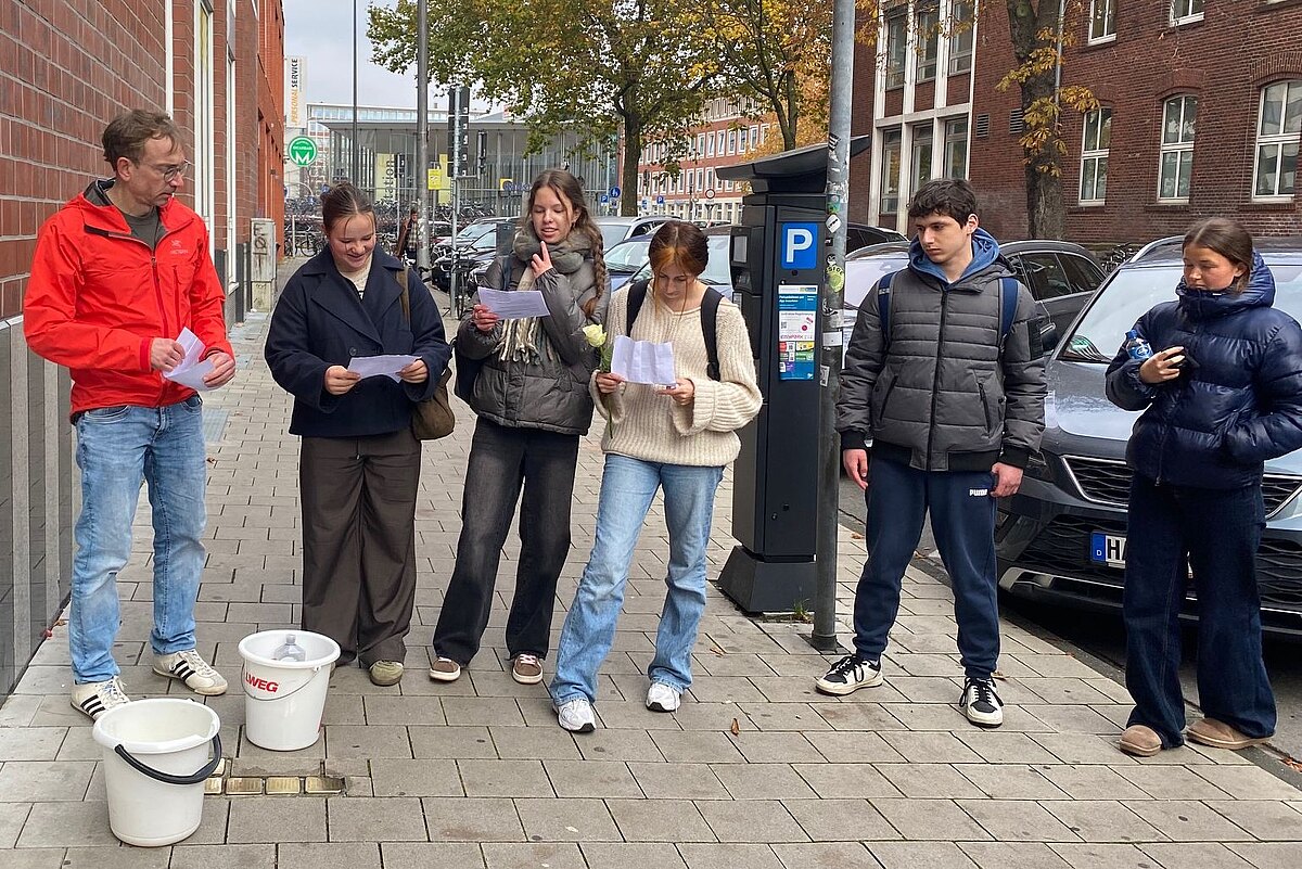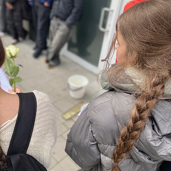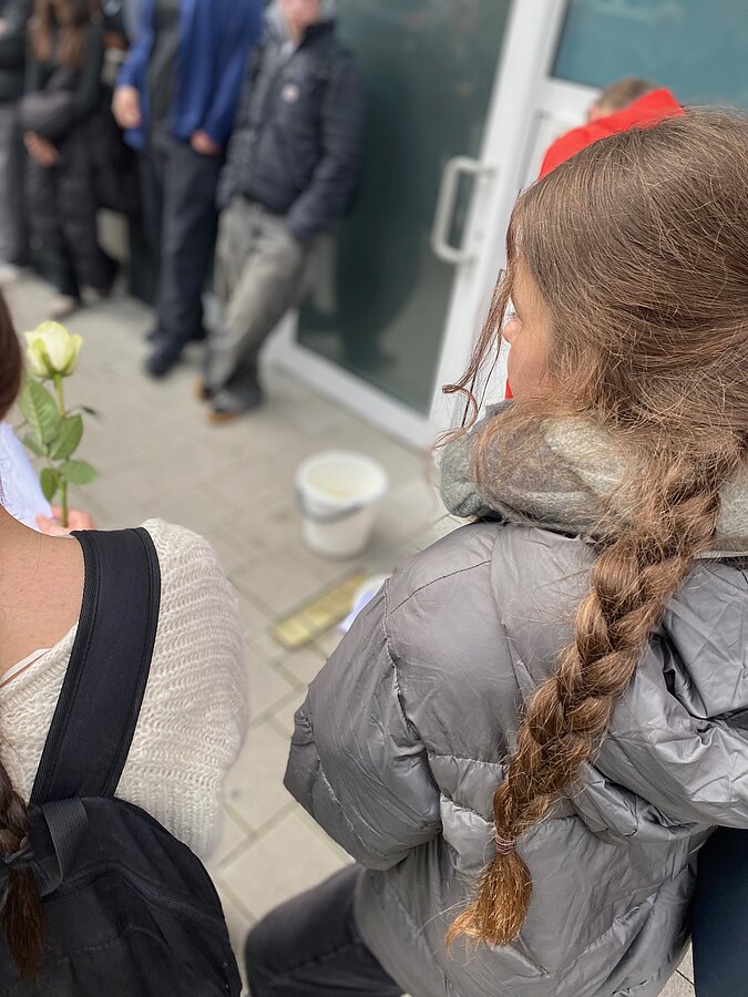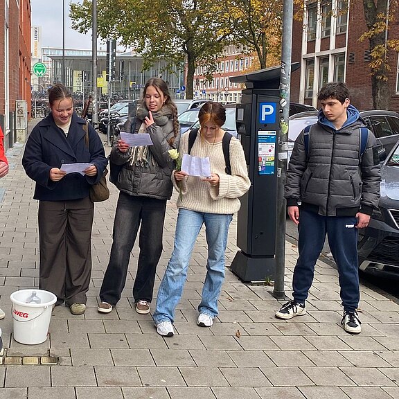 Am 9. November jährten sich die schrecklichen Novemberprogrome des Jahres 1938 zum 87. Mal. Aus diesem Anlass machten sich die SchülerInnen der 10b am Montag Vormittag auf den Weg in die Münsteraner Innenstadt, um dort einige Stolpersteine zu putzen. Diese Steine mit einer Messingplatte erinnern an Opfer des NS-Regimes und sind vor ihren letzten selbst gewählten Wohnorten in den Gehweg eingelassen. Bevor die SchülerInnen sich an das Polieren der Steine begaben, informierten sie sich über die Schicksale, die hinter den Steinen stecken. Anschließend legten sie eine weiße Rose ab - für die Opfer und gegen das Vergessen.