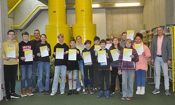 Im Rahmen einer kleinen Feierstunde in der Mediothek lobte Schulleiter Ralf Cyrus und MINT-Koordinator Markus Rommen die Leistung aller teilnehmenden Scholl-Schüler*innen und verteilten die Urkunden und Preise.