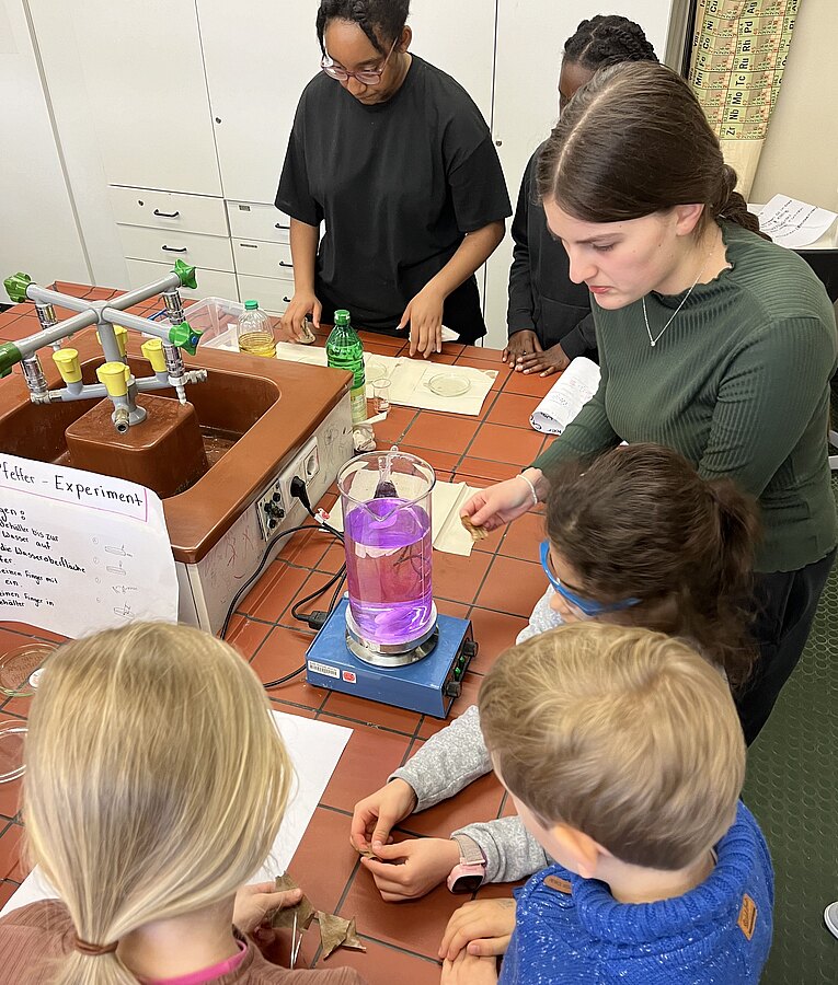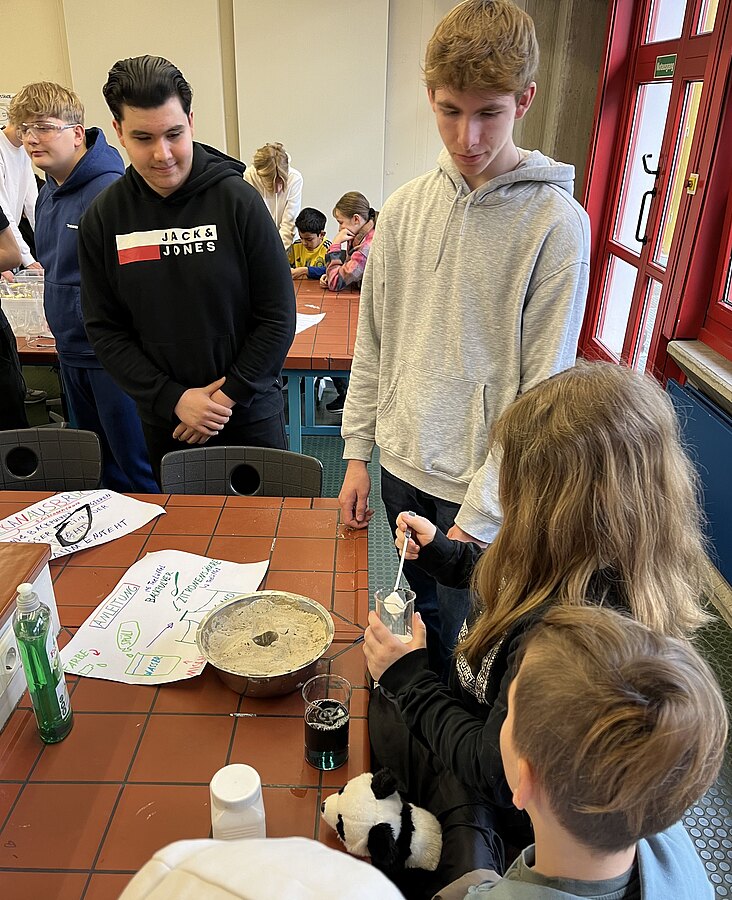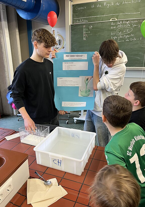 Dort wurden dann die selbst erarbeiteten Versuche der 10er-Schüler*innen im Chemie-Experimentalraum vorgestellt und auch erklärt. Leuchtende Augen bekamen die Grundschüler*innen bei den „coolen“ Experimenten zum „Feuerlöscher“ und zum „Vulkan“. Aber auch die anderen Versuche brachten die Grundschüler*innen zum Staunen und zum Nachdenken! - Letzteres insbesondere bei dem Versuch, der die Frage aufwarf: „Wie kann ein Stoff fest u n d flüssig sein?“