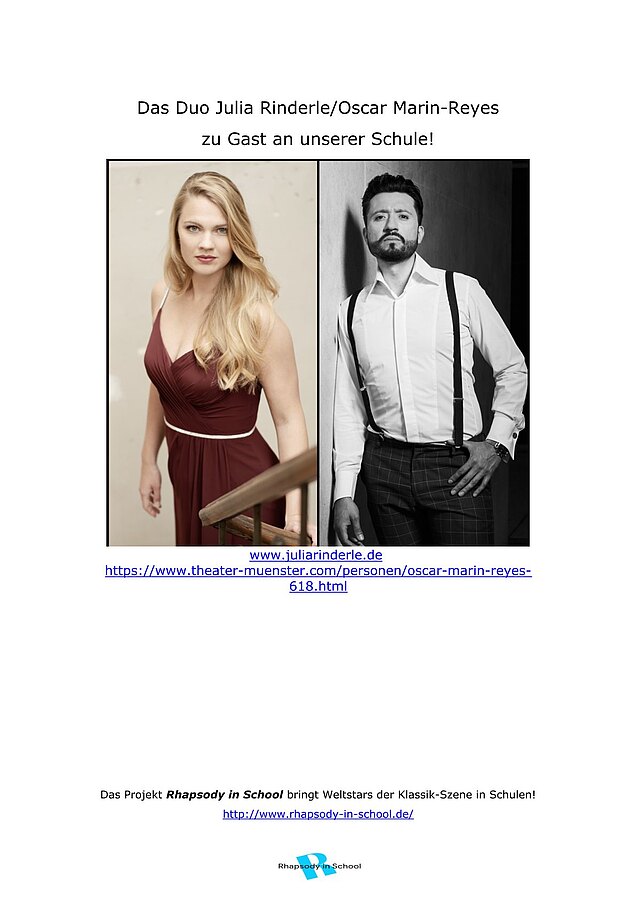 Julia Rinderle ist eine international erfolgreiche Pianistin, ihr Mann Oscar Marin-Reyes ist im Opernstudio des Theater Münster. Rhapsody goes Opera ist eine Sparte von Rhapsody in School, einer 2005 von dem Pianisten Lars Vogt gegründeten internationalen Künstler- Initiative, die bereits über 500 Stars der Klassikszene bundesweit und international in Schulen gebracht und Kindern und Jugendlichen das Ohr für klassische Musik und ihre Protagonisten geöffnet hat.