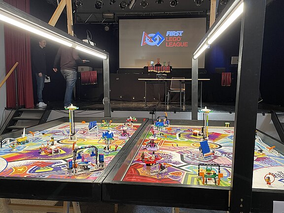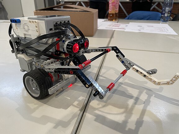 Danach ging es im Stundentakt an den Wettbewerbstisch zum Robot-Game. Im Training gab es noch große Schwierigkeiten, aber in der ersten Runde erspielte sich das Team 145 Punkte. Leider hatte der Roboter bei einer Station eine "Glasscheibe" kaputt gemacht (-20 Punkte). Zudem blieb er zweimal stecken und musste angefasst werden (-25 Punkte)