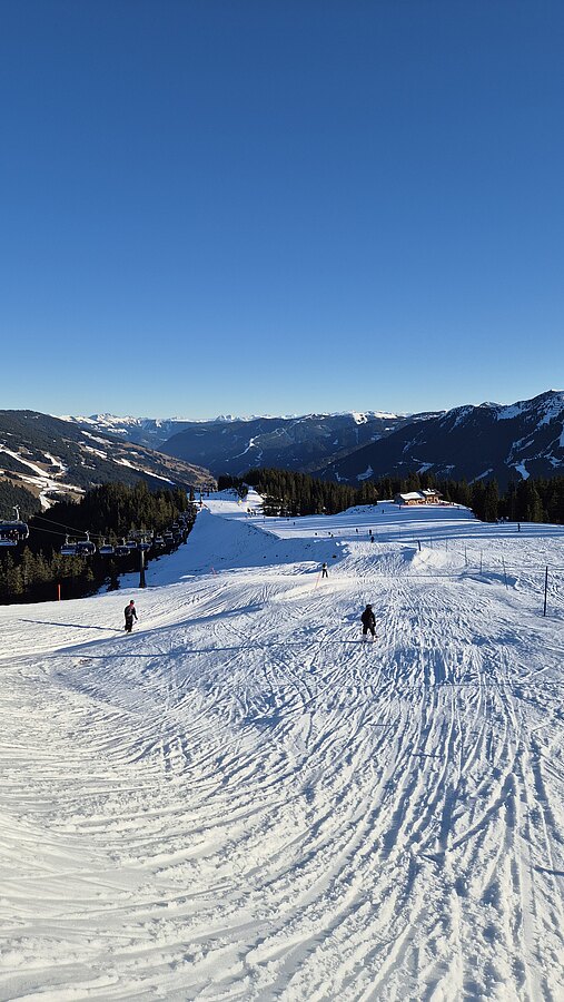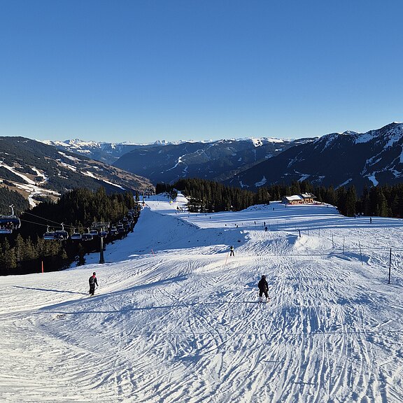 Für fortgeschrittene Fahrerinnen und Fahrer gab es eine eigene Gruppe, die nach einem kurzen Einfahren direkt mit der Gondel ins Skigebiet startete. Schnell wurde eine geeignete Piste gefunden: Am Bernkogel (6er-Lift) bot die blaue Piste Nr. 146 ideale Bedingungen, um dort in den folgenden Tagen auch den Unterricht mit den Anfängergruppen fortzusetzen.