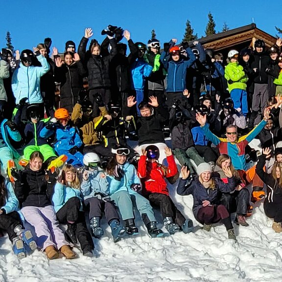 Am Freitag, dem letzten Skitag, trafen sich alle Gruppen noch einmal gemeinsam auf der blauen Piste am Bernkogel. So konnten alle Schülerinnen und Schüler zusammen fahren und ihr erlerntes Können Freundinnen und Freunden präsentieren. Der Spaß stand dabei deutlich im Vordergrund – insbesondere für diejenigen, die nun gemeinsam mit fortgeschrittenen Klassenkameradinnen und -kameraden unterwegs sein konnten.
