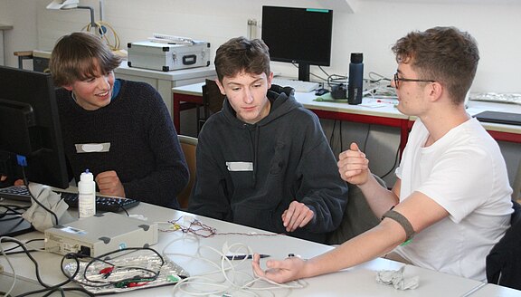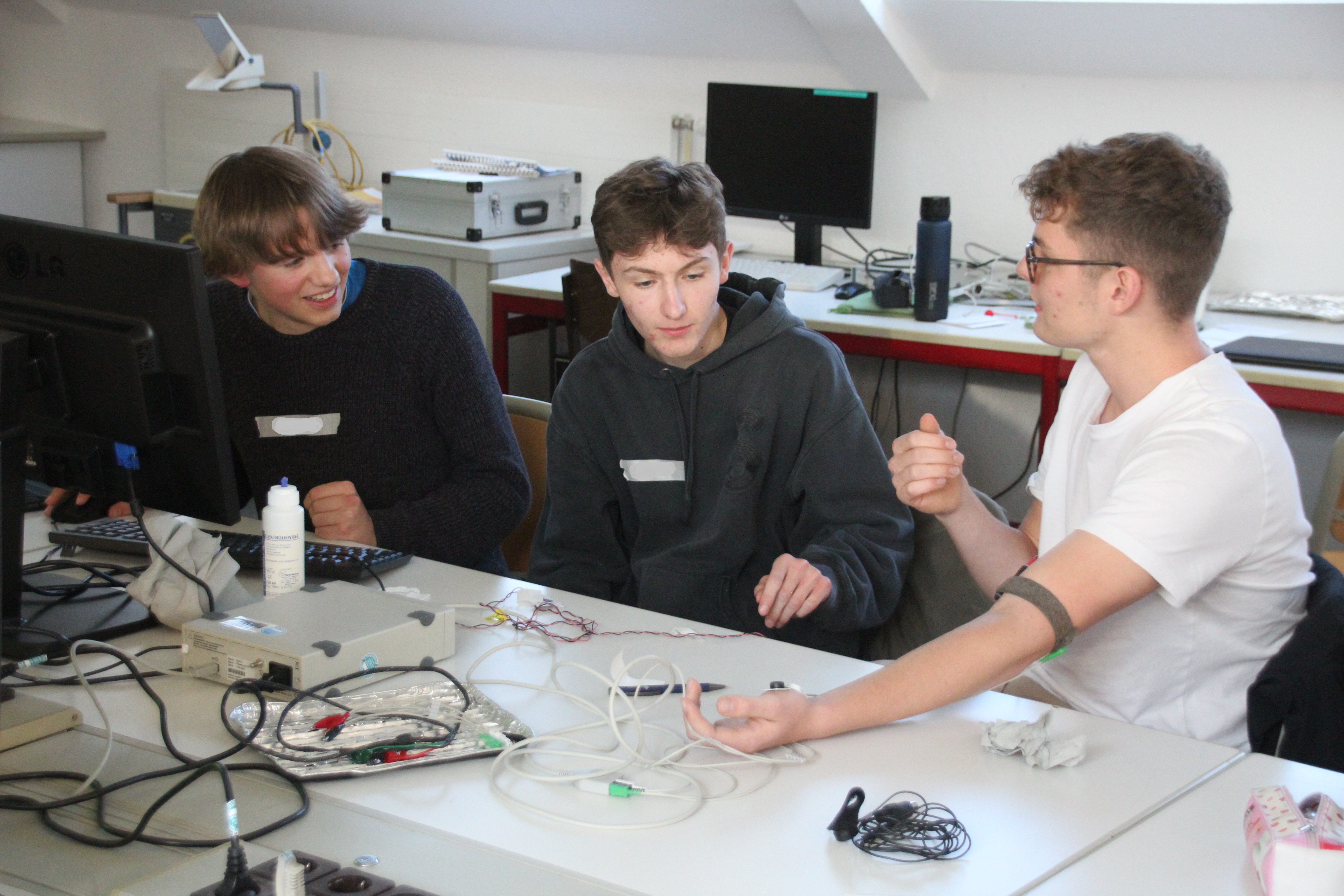 Doch dann ging es endlich los! Nach einer kurzen Einführung durch den Dozenten Dr. Roland Paul durften die Schüler*innen selbständig Versuche am intakten, aber betäubten Regenwurm und am Unterarm des Menschen (im Selbstversuch) durchführen. Neben der Ermittlung der Schwellenspannung und des Alles-oder-Nichts-Gesetzes konnten unter anderem auch die Leitungsgeschwindigkeiten myeliniserter und nicht-myelinisierter Axone ermitteln und verglichen werden.