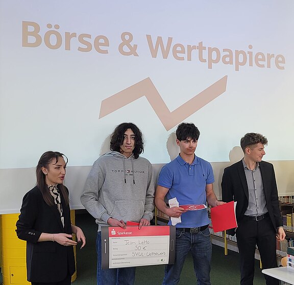 Die Börse bietet also neben großen Chancen - wie das Siegerteam eindrucksvoll unter Beweis stellte - natürlich auch Risiken, die man als Anleger gut kennen sollte. Darum wurde die Siegerehrung durch die Sparkasse Münsterland Ost von einem Vortrag über die Geldanlage in Aktien begleitet. Alle 10er Klassen hörten interessiert dem Vortrag der Sparkassenauszubildenen zu, denn Lenn und Mohammed hatten ja gezeigt - da geht was an der Börse. Herzlichen Glückwunsch!