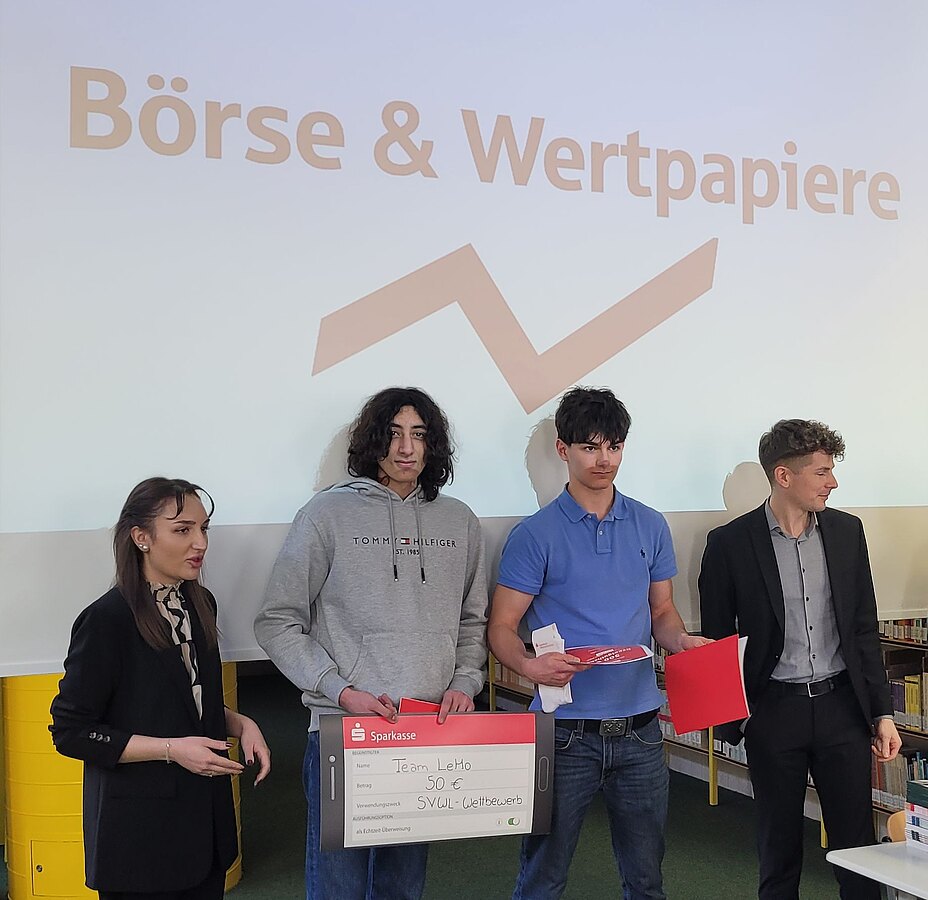 Das Team LeMo bestehend aus Lenn Benneweg und Mohammed Dergham aus der 10a konnte beim Planspiel Börse der Sparkasse Münsterland Ost den 1. Platz erringen. Nach einem Kopf-an-Kopf-Rennen mit dem Team Sahnerolle vom Hansa-Berufskolleg konnte man sich letztlich hauchdünn mit 46 € Vorsprung durchsetzen.