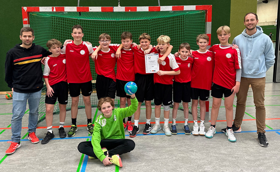 Am 7.12.23 fanden in der Altersstufe WK3 Jungen die diesjährigen Schulstadtmeisterschaften im Handball statt. Gespielt wurde in den beiden Sporthallen des Schulzentrums Kinderhaus. Im Modell Jeder gegen Jeden trat auch die Mannschaft des Geschwister-Scholl-Gymnasiums an und konnte sich am Ende als Stadtmeister vor jeder Menge Fans aus verschiedenen Klassen feiern lassen. Gespielt wurde jeweils für 2x10 Minuten. Im Auftaktspiel schlug das GSG die Mannschaft des Kardinal-von-Galen-Gymnasiums mit 18:6. Anschließend besiegte man die Mannschaft der Friedensschule (14:11) und konnte sich im dritten Spiel mit 23:13 gegen die Mannschaft des Hittorf-Gymnasiums durchsetzen. Im letzten Spiel des Direktvergleichs kam es dann gegen die bis dahin ebenfalls noch ungeschlagene Mannschaft des Immanuel-Kant-Gymnasiums zum Finalspiel um den Titel. Nach einem spannenden Spiel stand am Ende ein 17:12 Sieg auf der Anzeigetafel und der Jubel kannte keine Grenzen mehr. Vielen Dank an alle Zuschauerinnen und Zuschauer für eine tolle Stimmung, sowie an die Sporthelfer und die beiden Schiedsrichter für die Unterstützung.