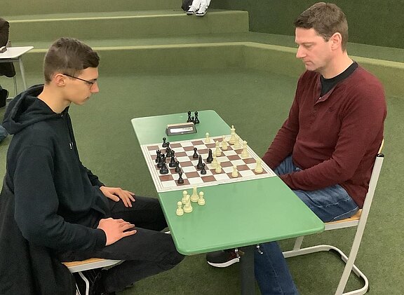 Auf Seiten der Lehrer musste unser Schulleiter Herr Cyrus leider passen, wichtige Organisationsaufgaben waren noch zu erledigen. „Ersetzt“ wurde er durch Florin Wehrum aus der 9a und spielte an der Seite von Herrn Dr. Brinkmann gegen Phil Benneweg und Carl Orthey (beide aus der 10a). Beide Seiten konnten das Match ausgeglichen gestalten. Gewinnideen von Herrn Dr. Brinkmann konnte Florian aber nicht erkennen und somit endete das Spiel Remis.