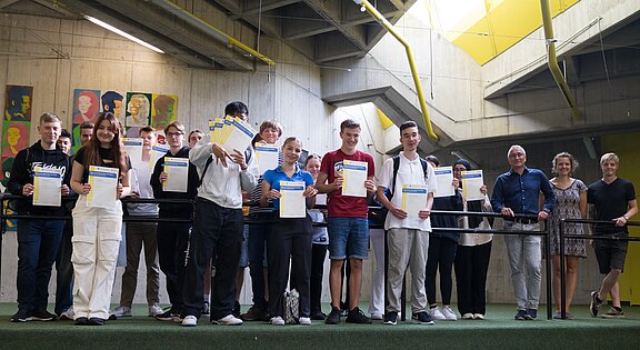 Mit den Urkunden wurde die intensive Arbeit des jetzigen Q2 Geschichtsleistungskurses von Frau Kuhlmann (Carl Zuther, Darß Diepholz, Fenja Ludwig, Houayda El Mokaddem, Jasper Süs, Kai-Ole Barth, Lennart Brönstrup, Louis Ortlepp und Vian Alhlal) und der aktuellen EF-Schülerin Elina Qaqus (unterstützt von Herrn Gehrmann) gewürdigt. Besonders die Schülerinnen und Schüler der jetzigen Q1 (Charlotte Zeller, Dalilah Hodroj, Felix Rüschenschmidt, Joschka Schwering, Josua Paßgang, Julien Michaelis, Kean Azamat, Laura Fleming, Lennard-Jan Lenz, Lia-Malin Große, Lilly Witte, Mariam Tawil, Mert Dayioglu, Mika Loheim, Nassim Saadi, Niels Pleye, Ruth Lütkenhaus, Sara Habash, Sophia Budny, Tim Zhou, Weronika Wloch und Milana Krom) aus dem damaligen Grundkurs Geschichte bei Frau Kuhlmann können ihre Förderpreisauszeichnung nun stolz in Händen halten.