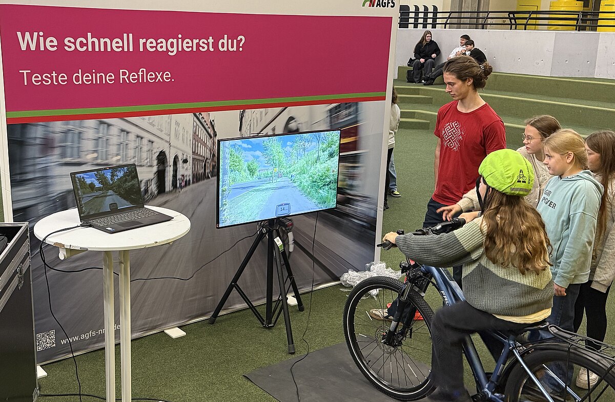 Am Fahrradsimulator und beim Button-Reaktionstest erfuhren die Kinder unmittelbar, wie wichtig Aufmerksamkeit und schnelle Entscheidungen im Straßenverkehr sind. Viele zeigten ehrgeizig ihre Reaktionszeiten zu verbessern.