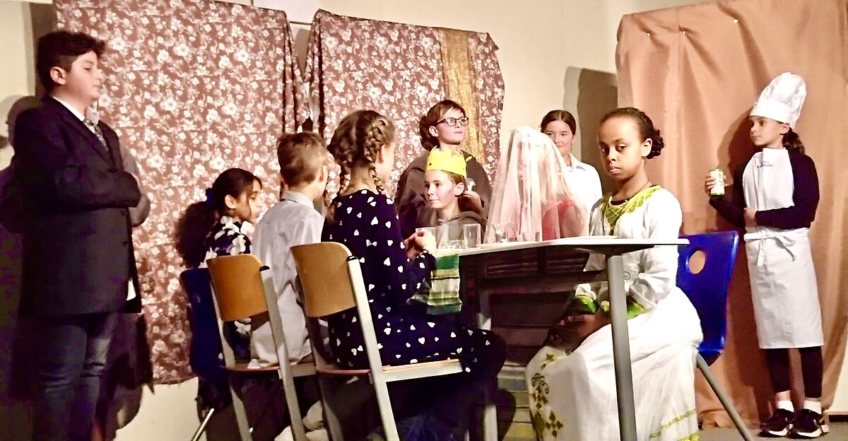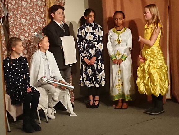 Die Schülerinnen und Schüler der 6b hatten die Aufführung im Anschluss an ein Märchen der Gebrüder Grimm zusammen mit ihrer Deutschlehrerin Frau Vagedes mit großer Begeisterung und Hingabe vorbereitet. Auf der „richtigen“ kleinen Theaterbühne in der ehemaligen Fremdsprachenwerkstatt gelang ihnen auf und hinter der Bühne eine hervorragende Darbietung.